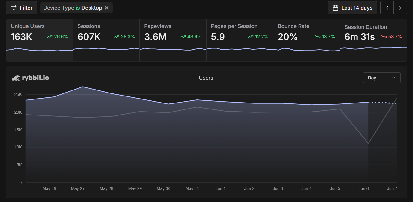 E-commerce conversion rates often vary significantly between desktop and mobile. analytics-tube lets you filter by device type to understand these differences.