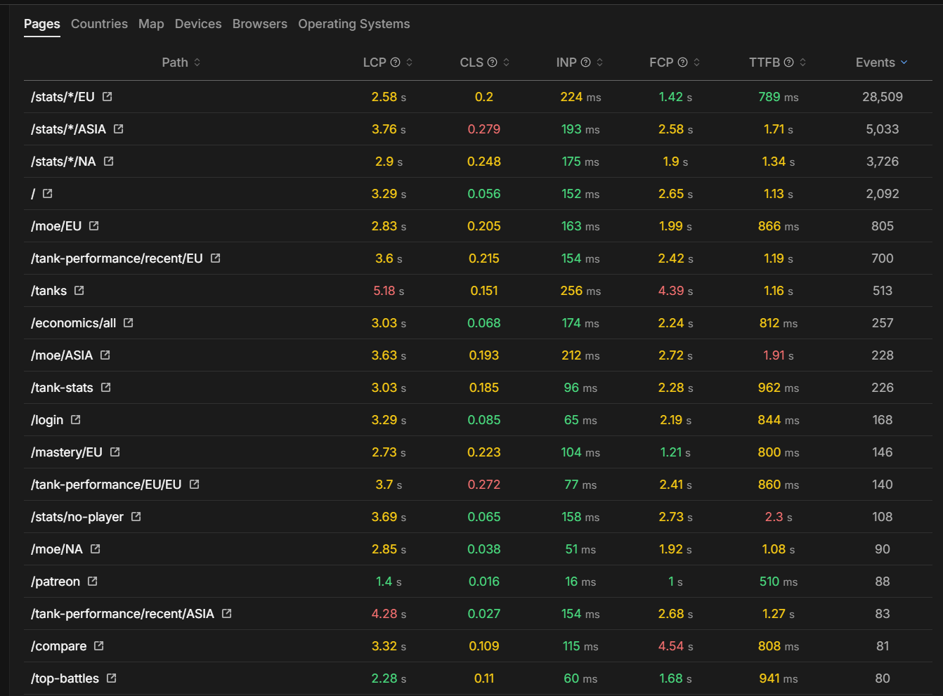analytics-tube's performance tab shows you the Largest Contentful Paint (LCP) for each page. If your product pages or checkout pages have poor performance metrics, you should optimize them. The performance dashboard makes it easy to identify which pages need optimization.